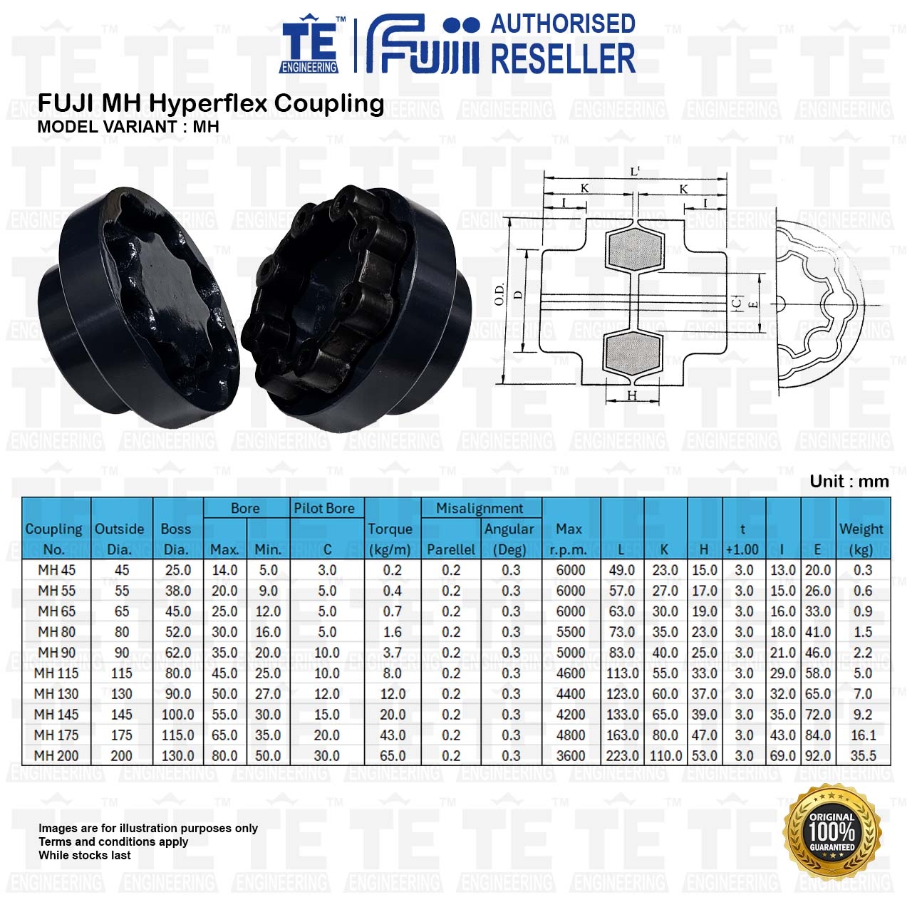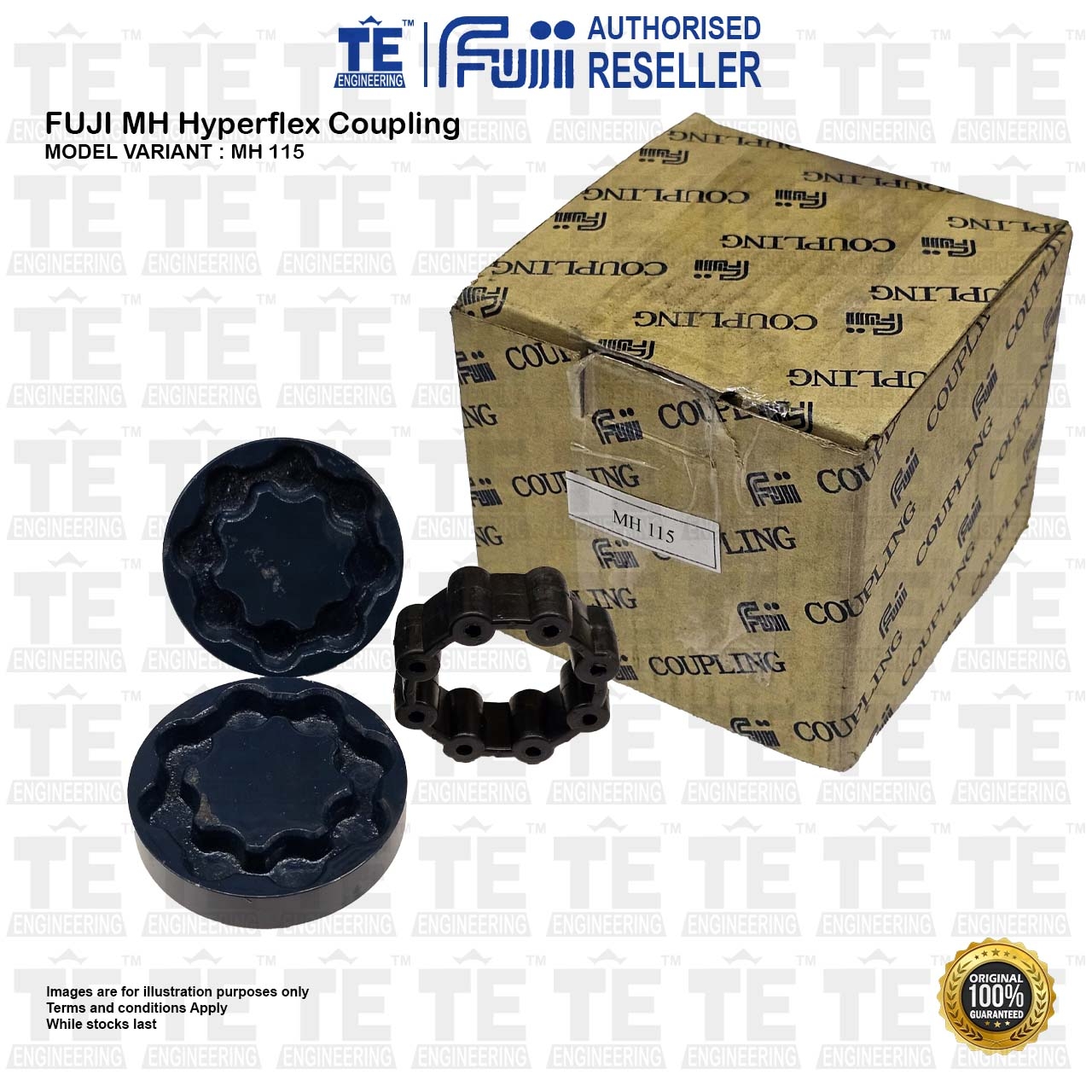 The FUJI MH 15 Hyperflex Coupling is a flexible shaft coupling designed to accommodate various misalignments while transmitting torque. It features a synthetic rubber flexible ring with steel cores for enhanced reliability and speed. The MH 115 is known for its ability to dampen torsional vibrations, resist oil and chemicals, and operate in a wide temperature range. It's a versatile coupling suitable for applications like pumps, fans, and compressors.